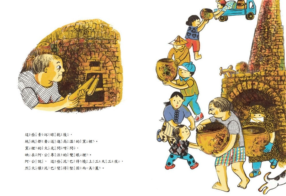 2020年高雄市立圖書館「好繪芽獎」首獎(好手獎)得主,張秀毓老師繼《爺爺的玻璃店》、《阿婆的燈籠樹》、《爸爸的友善茶園》後,再度以版畫為創作手法,從蛇窯的構造、陶藝的製程,再到傳統文化的復興,鉅細靡遺展現陶藝產業的風貌,潛移默化中陶冶美學涵養。