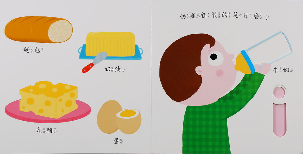 Smart寶寶小手推一推,書中圖畫變一變,學習說一說各式各樣食物的名字和顏色!