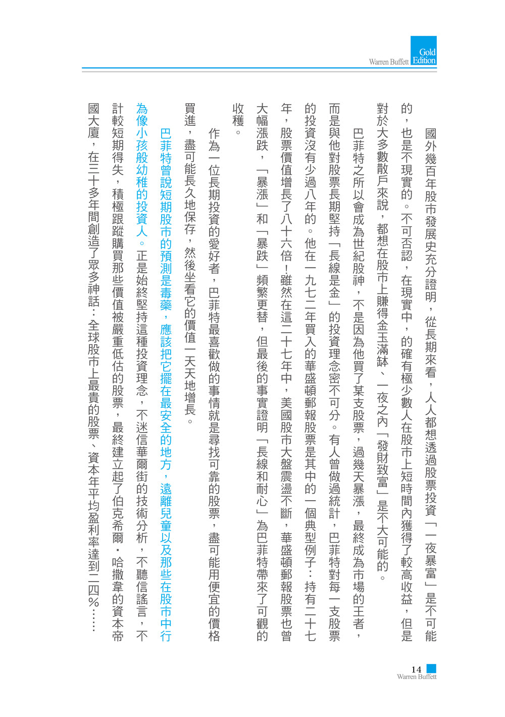 ■ 巴菲特的真正財富,並不是他擁有的億萬資產,而是他堅守了一生的投資理念。他的成功,靠的正是與眾不同的投資理念,不同的投資哲學與邏輯,不同的投資技巧。巴菲特證明了股票投資不只是碰運氣的遊戲,而是一種更合理更具體的事業;他結論出簡單質樸卻獨特深刻的投資哲學與方略,並透過不斷的執行經驗來詮釋其對於投資的正確性。這些投資哲學與理念幾乎已經成為當今每一個投資者的必備「聖經」。