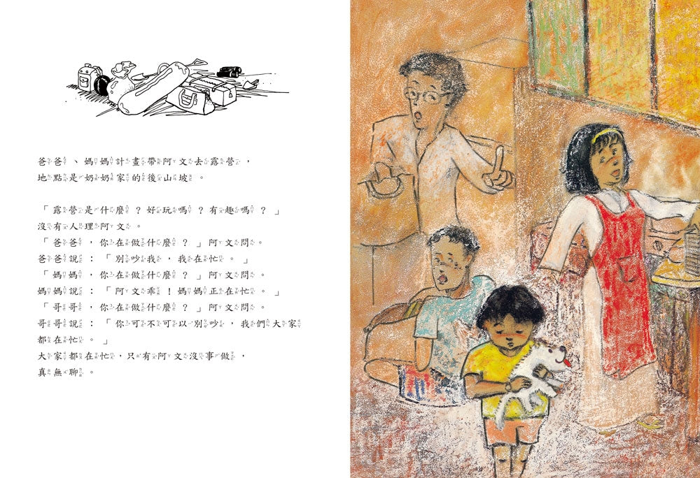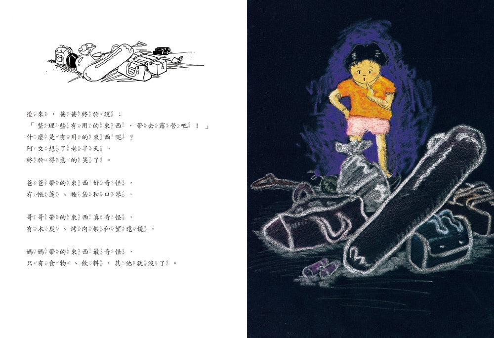 阿文和全家一起去露營,剛開始阿文覺得露營一點也不好玩,要睡在髒髒的地上,沒有冷氣吹,還要一切自己動手做。但後來,阿文從媽媽身上漸漸學習去體會大自然的奧祕與美,阿文開始覺得露營真不賴,而且下次還要和全家一起來。