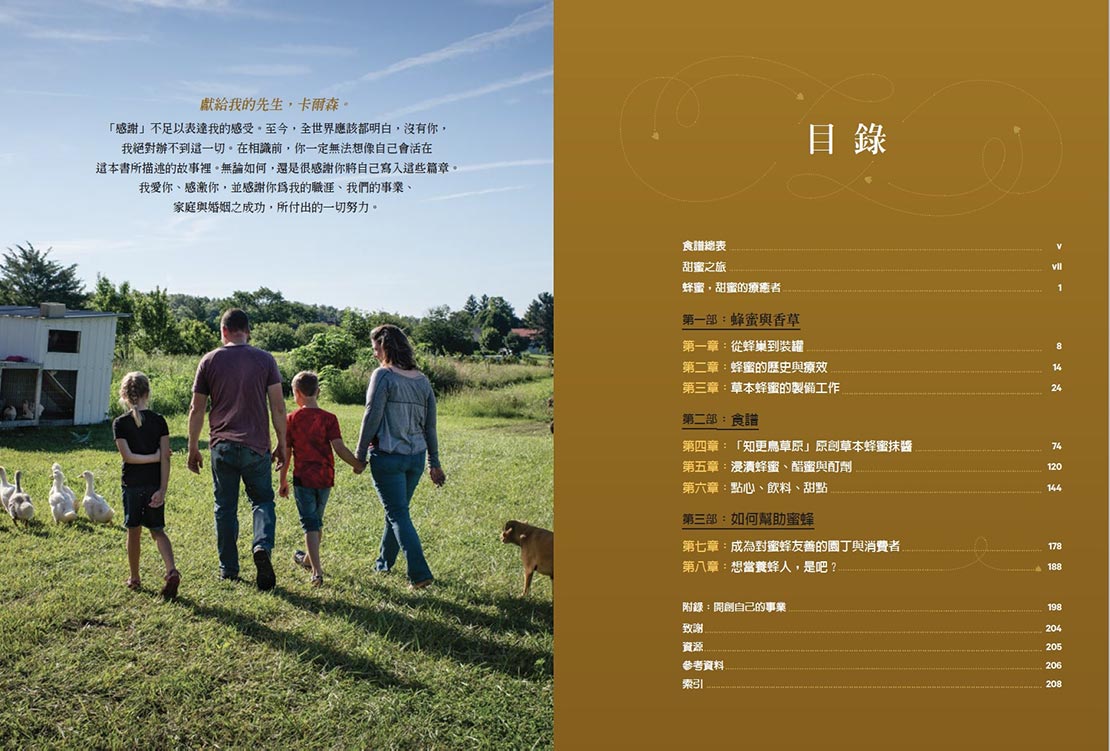 作者秉持著「創造具有療效的風味」之概念製作原創草本蜂蜜,並設計獨家配⽅以改善各種身體常見不適症狀。透過本書,讀者對於蜂蜜與植物的應用將有更深入透徹的了解,並學習如何在家中自製草本蜂蜜、蜂蜜茶飲、醋蜜、發酵蜂蜜製品等⽅法。食譜配方對應的層面包含緩解疼痛、改善睡眠、調解⼼情、孕期保養、兒童補鈣、感冒、過敏、腸胃道不適、皮膚症狀等;並提供結合甜點、果昔、特調飲品、糖果等更多創新應用。對於有機會接觸養蜂的人,書中概述其他具有療效的蜜蜂相關產品包括花粉、蜂膠和蜂王漿,並就如何永續經營與收穫這些產品提供建議。