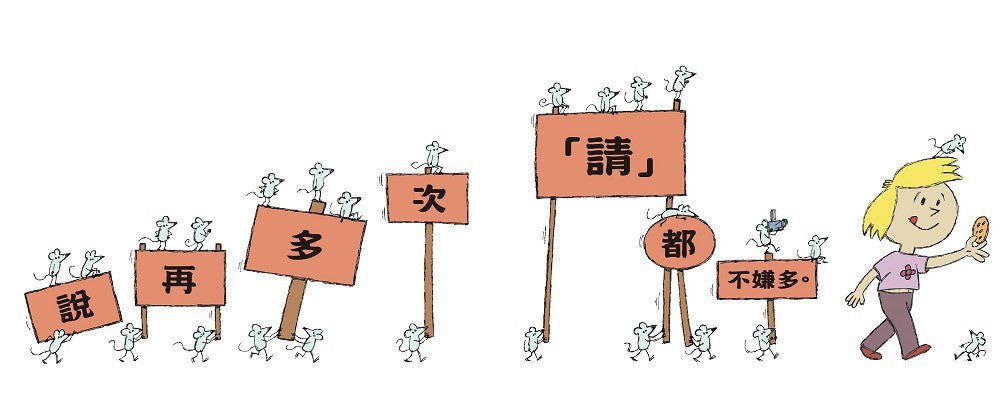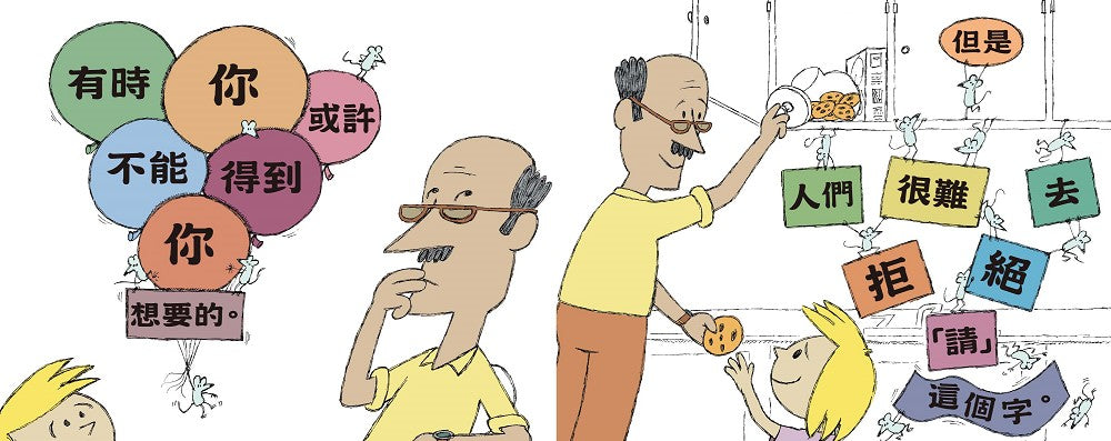 作者幽默地告訴小讀者,人們總是無法抗拒說「請」這個詞,並藉由一群老鼠循序漸進不斷引導,不只說「請」,「謝謝」、「對不起」、「不好意思」也是生活中必備的句子。本書提供父母有趣多樣的方式,帶孩子從小做個有禮貌的人,轉個彎,說不定就能輕鬆達到生活教育的目的。多多說請絕對有益!